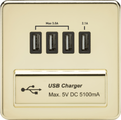 order code: SFQUADPBW | 230V Quad USB-A Charger Outlet (5V DC 5.1A shared) - Polished Brass with White Insert |