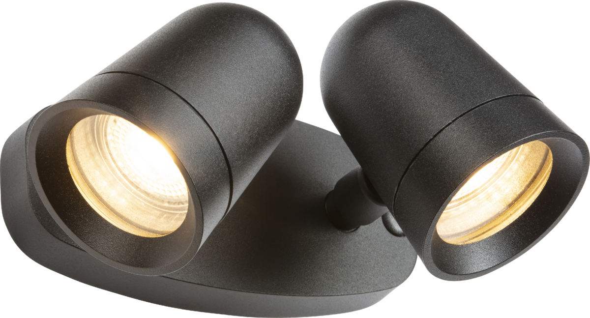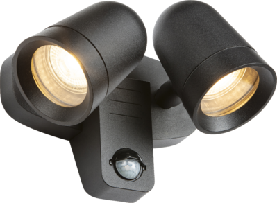 Enhance your outdoor lighting with Knightbridge's GU10 twin security spotlights. Available in standard and PIR options. Crafted from die-cast aluminium, offering a sleek finish with reliable qualities.