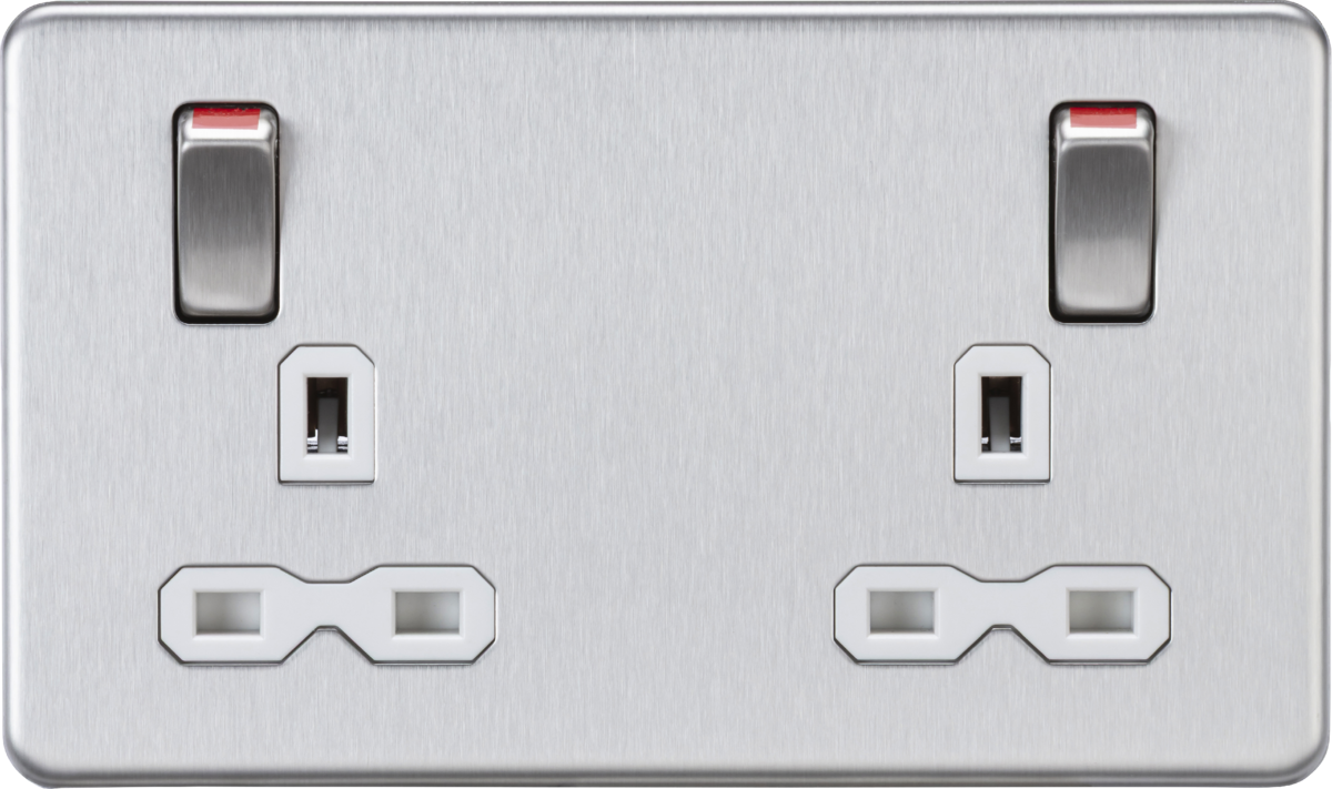 Perfect finishing touch to any modern home, flawless Screwless low profile metal design with matching metal outboard rockers with red flash detail, unique socket insert design that is completely hidden once a plug is inserted.