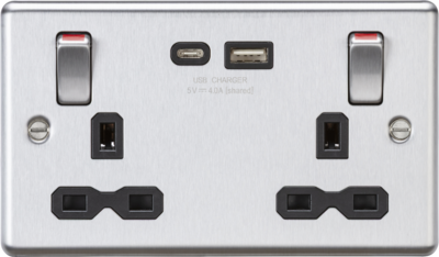 | MLA PART CODE | CL9941BC | | DESCRIPTION | 13A 2G DP Socket Dual USB A+C Metal Outboard Rockers with Red Flash - Brushed Chrome w/black insert | | NET WEIGHT (KG) | 0.228 | | FINISH | Brushed Chrome | | INSERT COLOUR | Black | | DIMENSIONS (MM) | Height - 85.75 Width - 146.5 Depth - 34.4 Projection - 12.9 Recessed Depth - 21.5 | | MINIMUM MOUNTING BOX DEPTH | 25mm | | CONSTRUCTION | Construction - 304 Stainless steel | | CLASS | I | | IP RATING | IP20 | | INPUT VOLTAGE | 230V 50Hz | | SWITCH TYPE | Double Pole | | EARTH TERMINAL | Yes | | LOAD/MAX. LOAD | 13A | | TERMINAL TYPE | Captive | | TERMINAL CAPACITY | 2 x 2.5mm² or 1 x 4.0mm² | | NO. OF USB PORTS | 2 | | NO. OF TYPE-A PORTS | 1 | | NO. OF TYPE-C PORTS | 1 | | USB CHARGING | 5V DC 4.0A (shared) | | ADDITIONAL FEATURES | Outboard Rockers | | WARRANTY | 2year(s) | | MANUFACTURED IN ACCORDANCE WITH | BS 1363-2 | | ORIGIN OF MANUFACTURE | China | | DECLARATION OF CONFORMITY (HELD ON FILE) | Yes | | EAN | 5056270891539 |