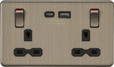 | MLA PART CODE | SFR9941AB | | DESCRIPTION | 13A 2G DP Socket Dual USB A+C Metal Outboard Rockers with Red Flash - Antique Brass w/black insert | | NET WEIGHT (KG) | 0.278 | | FINISH | Antique Brass | | INSERT COLOUR | Black | | DIMENSIONS (MM) | Height - 87.5 Width - 147.5 Depth - 34.4 Projection - 9.7 Recessed Depth - 24.7 | | MINIMUM MOUNTING BOX DEPTH | 35mm | | CONSTRUCTION | Construction - SPCC Steel | | CLASS | I | | IP RATING | IP20 | | INPUT VOLTAGE | 230V 50Hz | | SWITCH TYPE | Double Pole | | EARTH TERMINAL | Yes | | LOAD/MAX. LOAD | 13A | | TERMINAL TYPE | Captive | | TERMINAL CAPACITY | 2 x 2.5mm² or 1 x 4.0mm² | | NO. OF USB PORTS | 2 | | NO. OF TYPE-A PORTS | 1 | | NO. OF TYPE-C PORTS | 1 | | USB CHARGING | 5V DC 4.0A (shared) | | ADDITIONAL FEATURES | Outboard Rockers | | WARRANTY | 2year(s) | | ORIGIN OF MANUFACTURE | China | | DECLARATION OF CONFORMITY (HELD ON FILE) | Yes | | EAN | 5056270891690 |